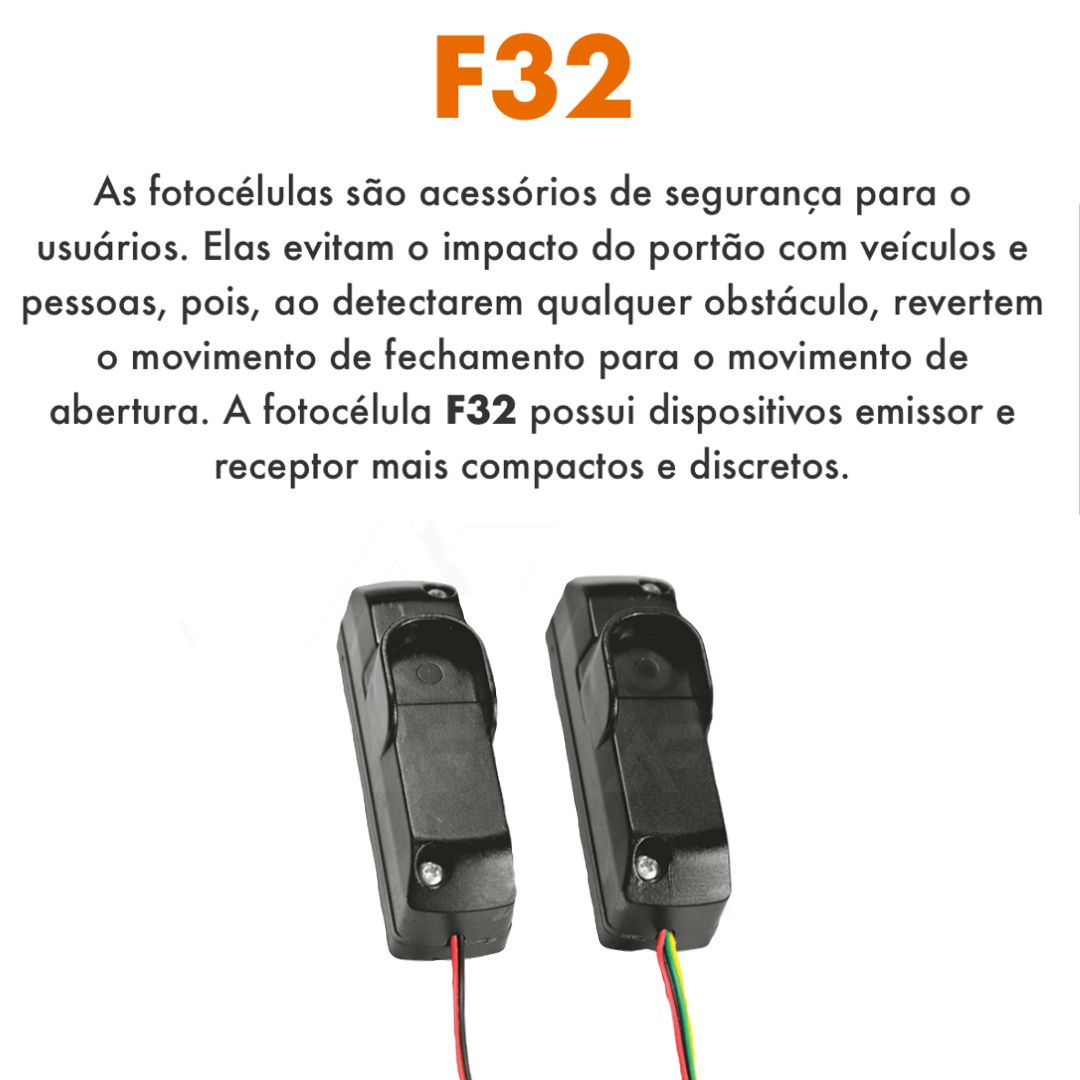 As fotocélulas são acessórios de segurança para o usuários. Elas evitam o impacto do portão com veículos, pessoas ou animais domésticos, pois, ao detectarem qualquer obstáculo, revertem o movimento de fechamento do portão para o movimento de abertura. A fotocélula F32 possui dispositivos emissor e receptor mais compactos e discretos.